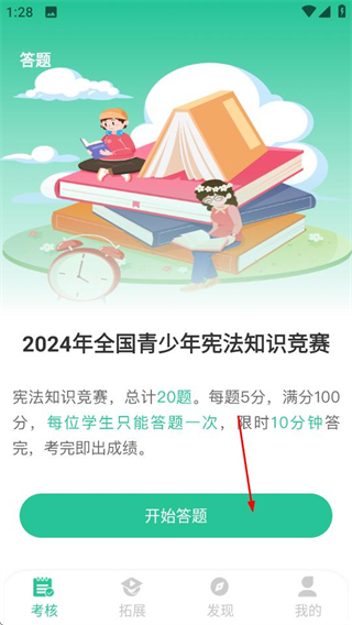 1、在考核页面找到2024年全国青少年宪法知识竞赛入口,点击开始答题按钮。