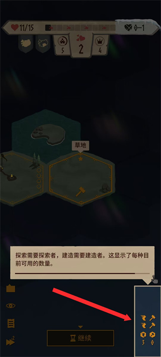 1、在地图界面中,点击红色箭头指向的继续按钮,关闭引导提示并推进地图探索流程,解锁新区域的关键操作。