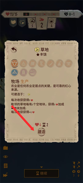 2、进入草地地块的建筑界面后,点击红色箭头指向的建造按钮,消耗对应资源建造牧场,获取资源稳定产出。