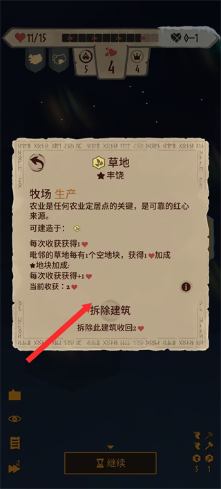 4、若资源不足,在牧场建筑界面点击红色箭头指向的拆除建筑按钮,回收部分红心资源,灵活调整配置。