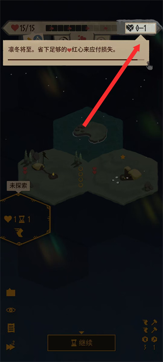 3、看到凛冬将至的提示后,留意红色箭头指向的红心资源栏,提前储备足够红心以应对后续资源损耗。