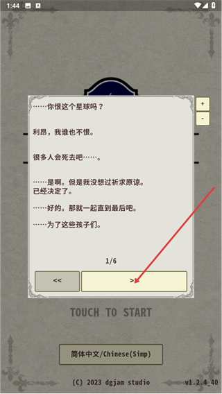 2、在这段剧情对话界面中,查看相关内容后,点击箭头按钮推进1/6的剧情流程。