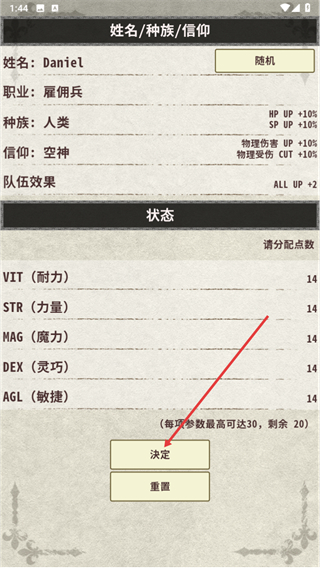 3、在姓名/种族/信仰与状态界面分配好属性点数后,点击决定按钮确认角色创建。