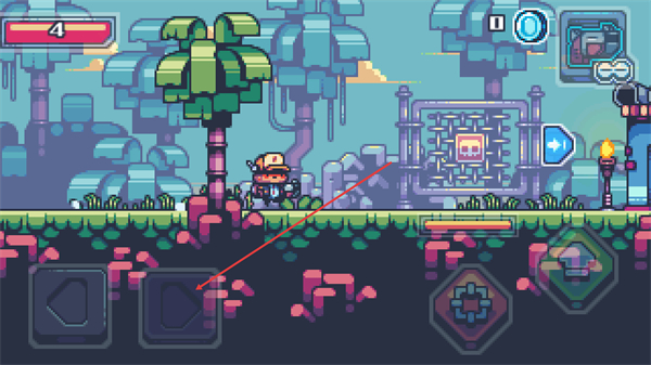 2、进入游戏场景后,通过底部的移动按键操控角色移动,向带有骷髅标识的区域前进,推进关卡的进度。