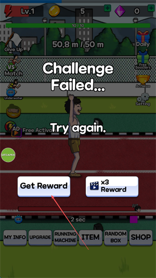 4、赛跑结束后显示ChallengeFailed...,点击GetReward领取对应奖励。