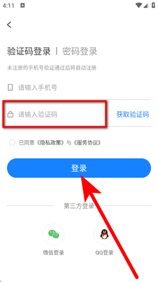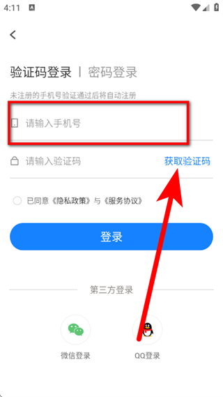 3、在验证码登录页面,输入手机号,点击获取验证码。