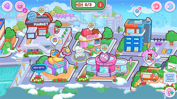 2、进入多普莱斯世界的主场景后,可前往MARKET、GLAMSTUDIO等建筑互动,同时完成收集3个姜饼人的任务。