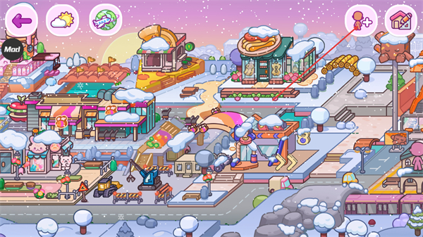 1、在这个卡通城市场景中,点击右上角带加号的人物图标,即可进入与角色相关的操作界面。