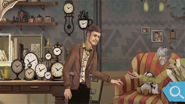 4、穿过大门后回到了现实世界,点击右侧的放大镜图标,与现实世界中的角色互动,获取其手中物品以推进游戏进程。