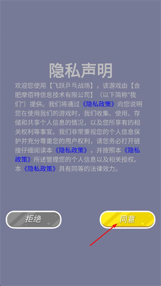 1、进入游戏界面后,找到隐私声明里的同意按钮,点击该按钮,完成隐私政策的确认操作。