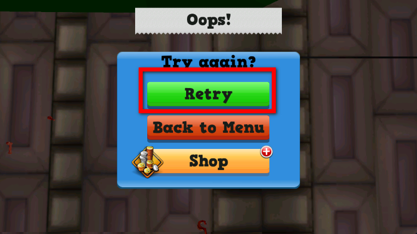 1、若游戏失败,点击Retry按钮,重新进入游戏关卡。