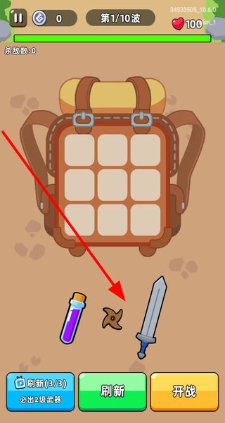 1、进入第1波对战前,将下方出现的武器拖入背包格子,可选择刷新按钮更换武器,配置好后点击开战按钮,即可开启对战。