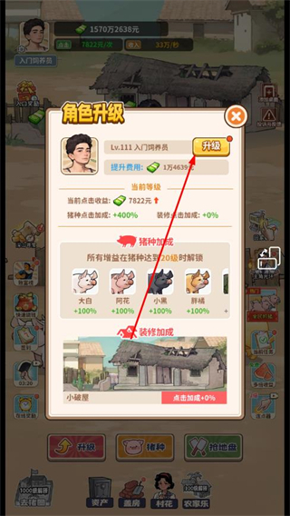 猪种设计为大白、阿花等拟人化形象,升级后不仅能提升收益,还能解锁点击收益+100%的突破效果,将传统数值养成转化为陪伴猪种成长的趣味体验。