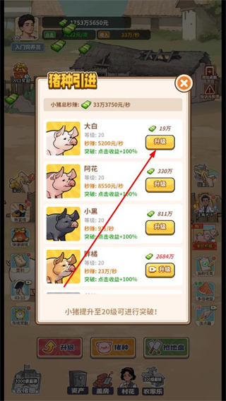 2、点击“猪种”按钮进入猪种引进界面,选择已解锁的猪种,点击升级提升猪种等级,解锁点击收益+100%的加成。