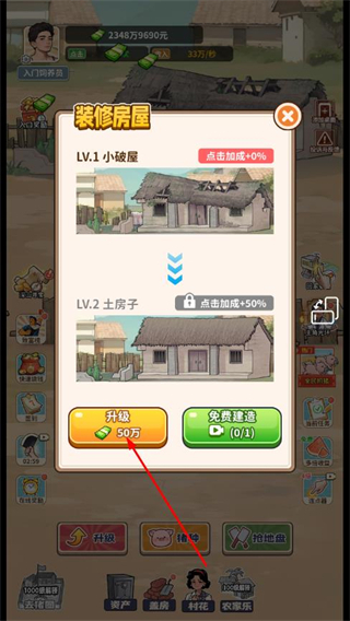 4、点击盖房进入装修房屋界面,消耗资金升级房屋,解锁点击加成+50%的属性,持续扩大财富积累效率。