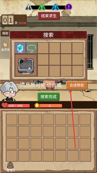2、完成搜索后点击搜索完成,查看获得的物资,可拖动同品质物品合成。