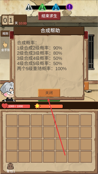 3、查看合成帮助了解合成概率,比如1级合2级概率90%,看完后点关闭。