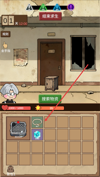 4、再次点击搜索物资收集新物资,积累背包物品,推进求生流程。