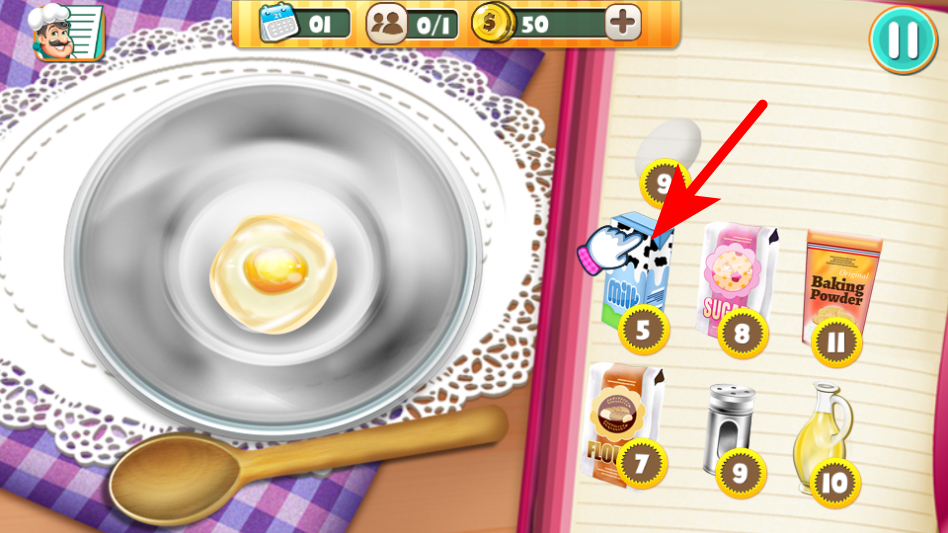 1、在蛋糕原料调配环节,点击右侧食材栏中的牛奶,将其添加到装有鸡蛋的容器中。