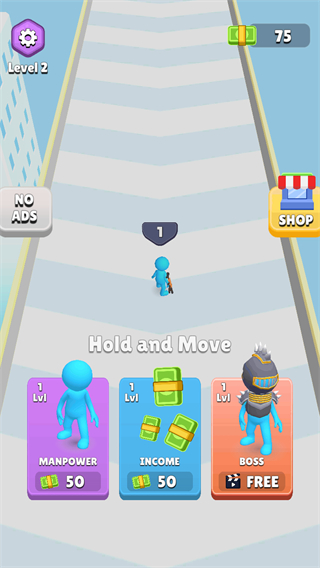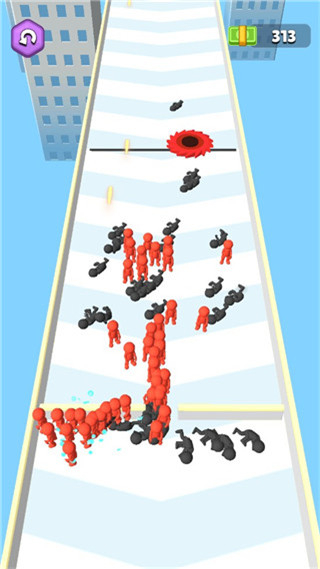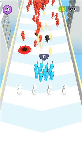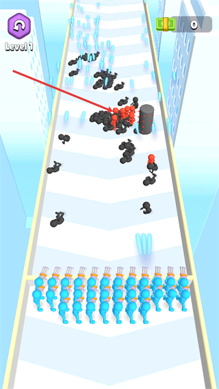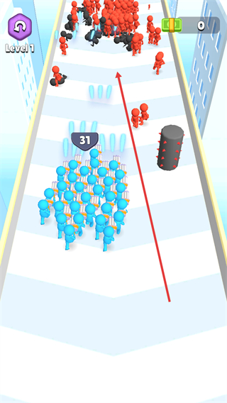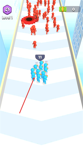 1、在Level1中,带领蓝色队伍初始11人前进,收集人数增益道具提升队伍规模。