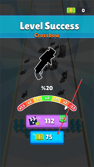 4、通关后显示LevelSuccess,点击领取75金币奖励,解锁新武器推进游戏。