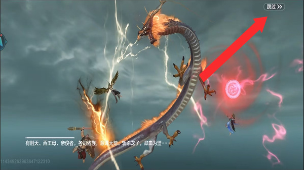 2、在剧情展示界面,点击红色箭头指向的跳过按钮,快速跳过当前剧情内容,直接进入后续游戏环节。