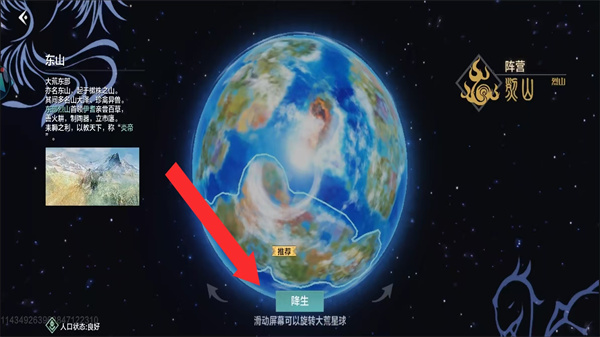 3、在星球交互界面,点击红色箭头指向的降生按钮,完成角色在星球的降生操作,开启游戏核心流程。