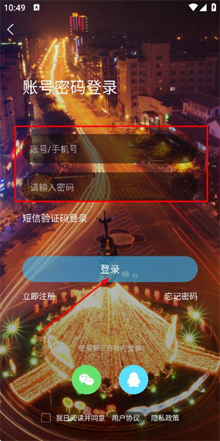 3、在登录页面填写手机号和密码,勾选协议后,点击登录完成账号登录操作。