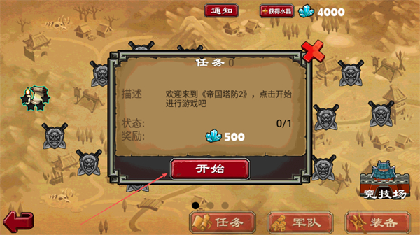 1、点击任务界面的开始按钮,开启游戏并完成初始任务,领取500奖励。