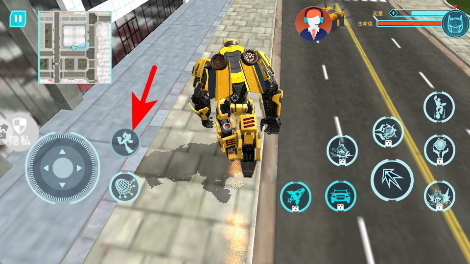 3、在移动过程中,再次点击红色箭头指向的动作按钮,提升机甲的移动效率,更快抵达任务指定地点。