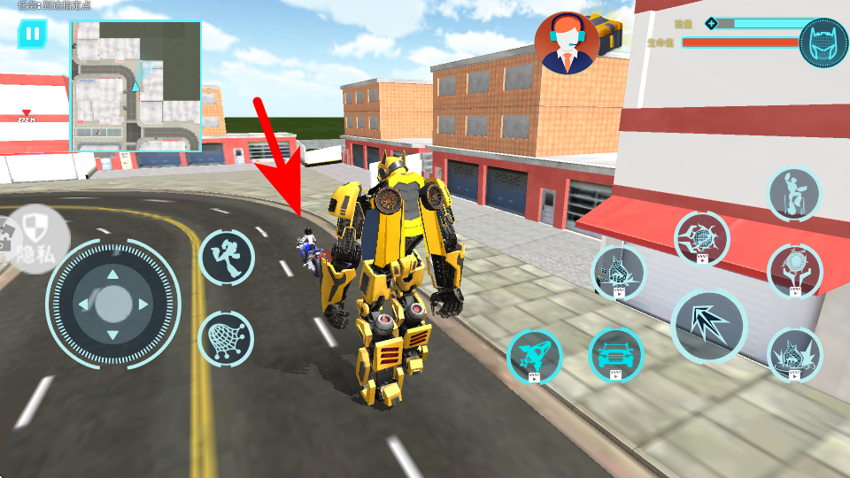 4、接近任务目标时,通过方向操控盘调整机甲站位,配合红色箭头指向的技能按钮发起攻击,推进流程。