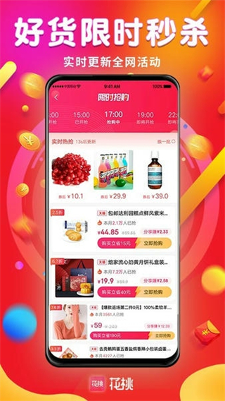 花桃是一款国内知名的汇聚全网网购商城优惠券的电子商务平台,核心整合海量优惠券检索、多平台商品比价、购物返利领取、好物榜单推荐、订单管理同步功能,适配日常购物、囤货比价、省钱消费等场景,无需多平台切换即可实现“找优惠、比价格、领返利、购好物”,成为用户网购的专属省钱助手。