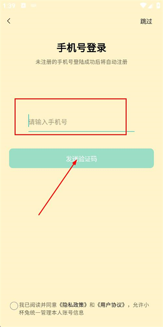 4、在手机号登录页面填写手机号,勾选协议后,点击发送验证码。