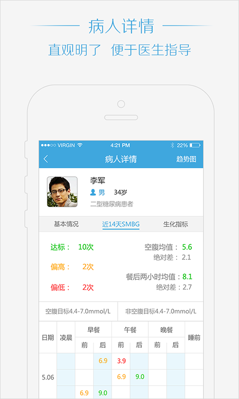 糖医工作站app是一款专门为医护人员打造的在线管理糖尿病患者的手机软件,可以使用软件随时了解患者的详细资料以及病人详情,还能随时检查病人的血糖情况,进行及时的监控患者情况。