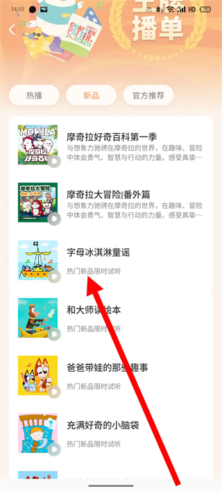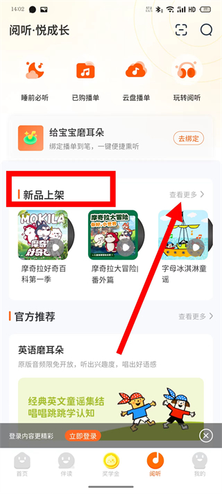 2、在阅听页面,点击新品上架更多,进入新品播单列表页面。