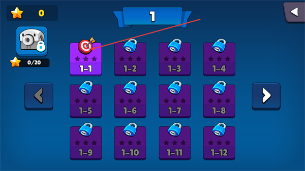 1、在关卡选择界面找到已解锁的1-1关卡,点击该关卡对应的标识,即可进入该关卡的游玩流程。