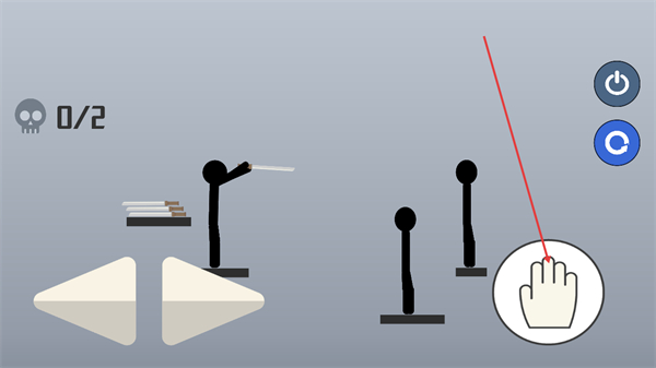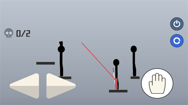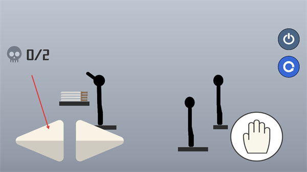 1、进入该关卡后,可通过左侧箭头控件调整火柴人手臂的位置,目标是击败场景内的2个火柴人。