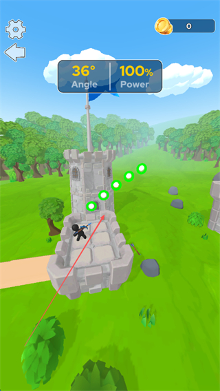 2、调整Angle为36°、Power为100%,发射箭矢击中目标。