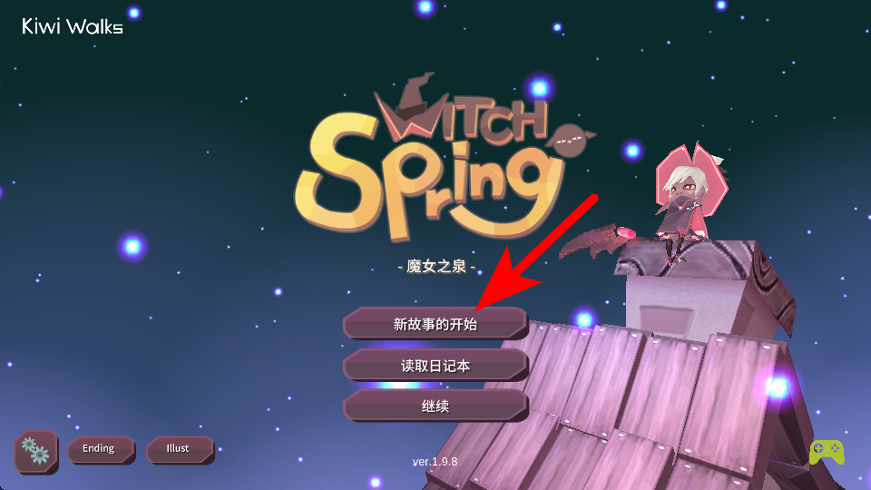 1、进入魔女之泉主界面后,点击红色箭头指向的新故事的开始按钮,开启游戏的全新剧情流程,进入游戏操作。