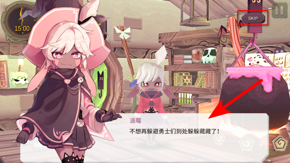 2、在剧情对话界面,可点击红色箭头附近的SKIP按钮跳过对话若需快速推进,或等待对话结束后继续操作。