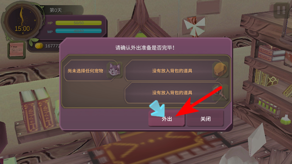 3、在外出准备弹窗中,点击红色箭头指向的外出按钮,确认准备并进入探索场景,推进游戏的冒险流程。