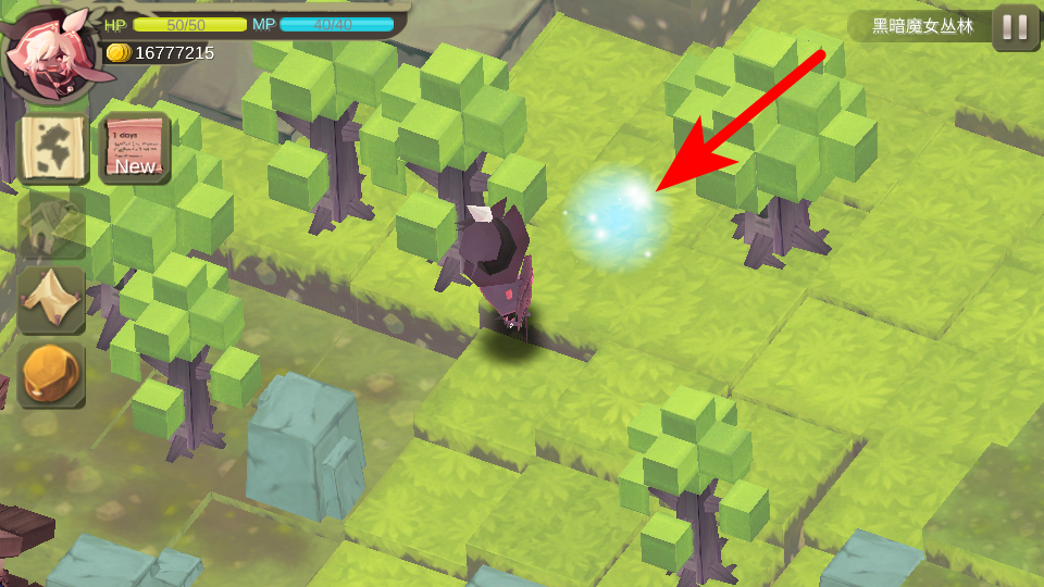 4、进入黑暗魔女丛林后,跟随红色箭头指引,向发光区域移动,触发场景互动如采集、战斗等,推进探索进度。
