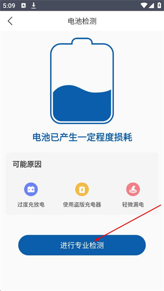 2、在电池检测页面,点击进行专业检测按钮,进入电池健康详情页面。