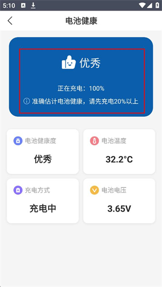 3、在电池健康页面,查看电池健康度、电池温度等状态信息,了解电池当前情况。