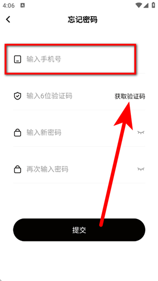 4、在忘记密码页面,输入手机号,点击获取验证码。