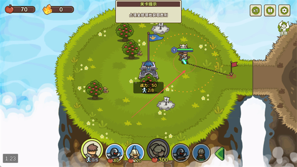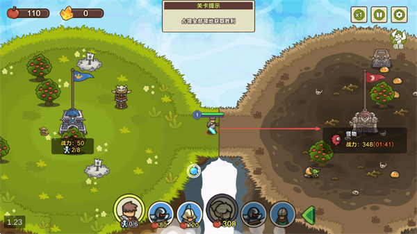 2、根据关卡提示,提升战力后派遣士兵抢占地块。