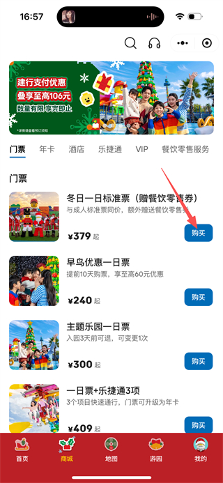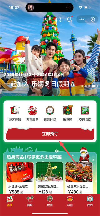 1、打开上海乐高乐园度假区首页,点击立即预订按钮进入预订页面。