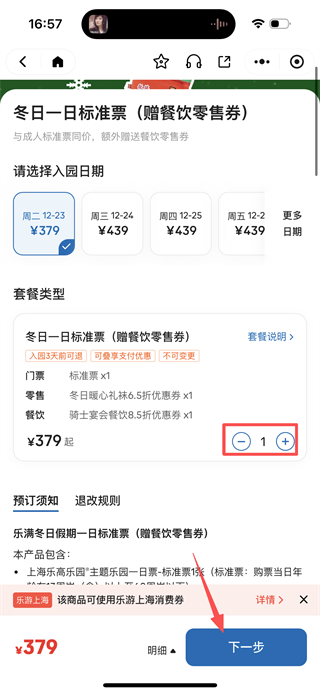 3、在门票详情页选择好后,点击下一步进入订单填写页面。
