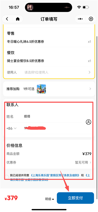 4、在订单填写页完成订单支付,即可完成预约操作。