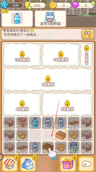 3、合成出矿泉水等级2,解锁更高等级物品,继续合成。